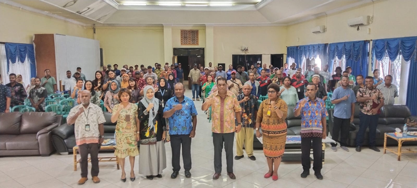 Plt Sekda didampingi plt Kadisdukcapil Kabupaten Jayapura berphoto bersama usai membuka kegiatan pengumpulan, analis dan diseminasi data terkait pendaftaran penduduk dan perkembangan penduduk OAP.