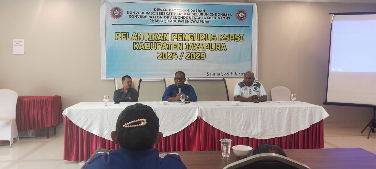 Kilaspapua, Sentani – Ketua Dewan Pimpinan Daerah,(DPD) Konfederasi Serikat Pekerja Seluruh Indonesia,(K-SPSI) Provinsi Papua, Yahya Waromi melantik Esau Yapo sebagai Ketua DPC K-SPSI Kabupaten Jayapura periode 2024-2029 disalah satu hotel di Kota Sentani. Hal itu tertuang didalam SK No. KEPSK.001/ORG/K.SPSI/06/VII/2024 tentang pengesahan komposisi personalia pengurus Dewan Pimpinan Cabang,(DPC) Kabupaten Jayapura serikat pekerja seluruh Indonesia Provinsi Papua periode 2024-2029 ditandatangani Ketua DPD K-SPSI, Yahya Waromi dan Sekretaris, A. Adriner Anderi, Sabtu (6/7/2024).