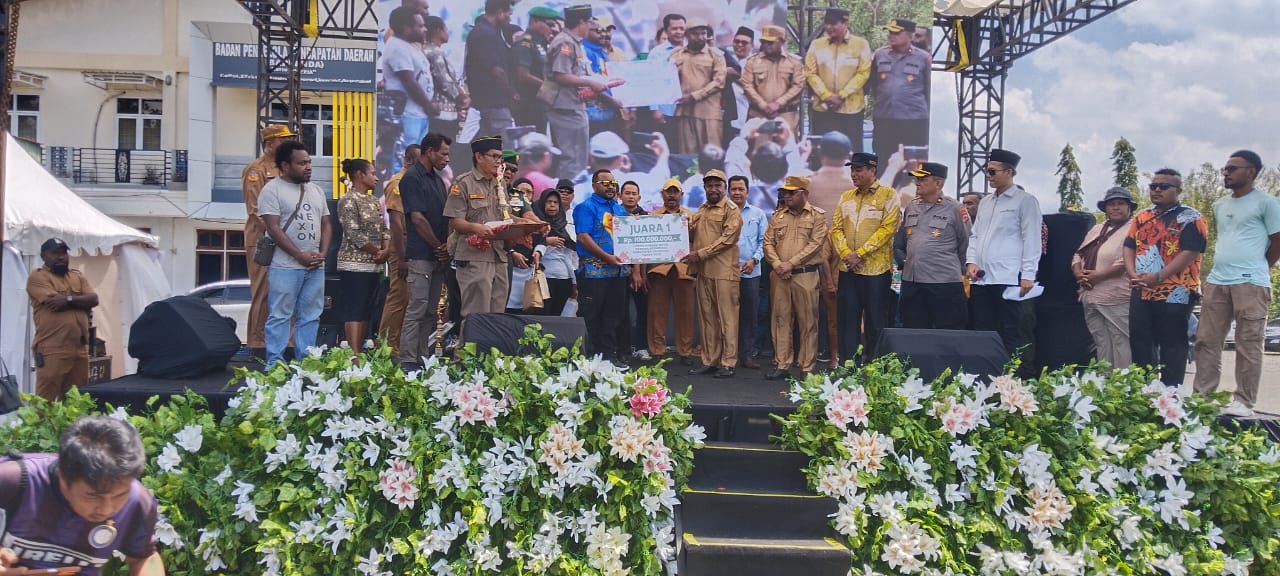Bupati didampingi Wabup Jayapura saat menyerahkan hadiah kepada juara I lomba pondok natal pemuda berkreasi Kabupaten Jayapura tahun 2025 dilapangan apel kantor Bupati Jayapura.