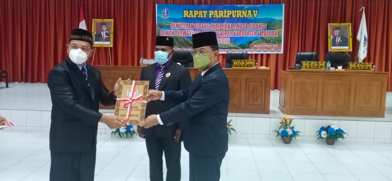 Wakil Ketua I DPRD Kabupaten Jayapura saat menyerahkan dokumen berisikan 4 Raperda yang disetujui kepada Asisten II Bidang Perekonomian Setda Kabupaten Jayapura. disaksikan Ketua DPRD.