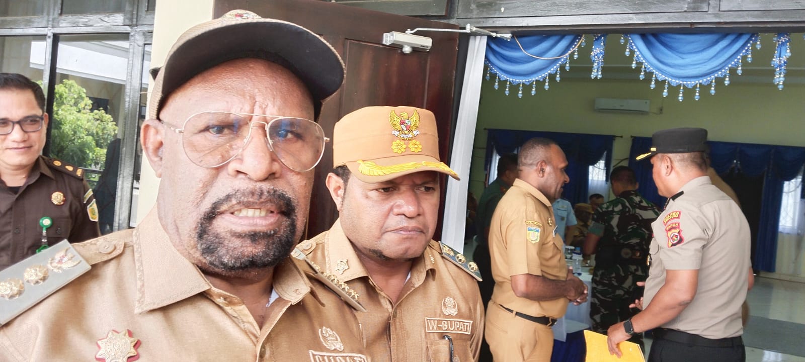 Bupati Jayapura, Yunus Wonda didampingi wakil bupati Jayapura saat diwawancarai.