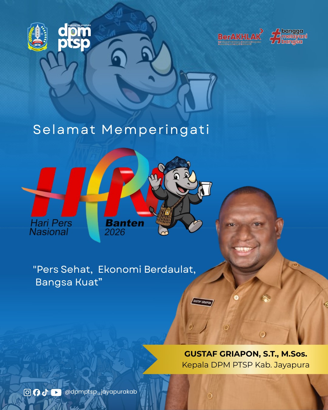 Kilaspapua, Sentani – Kepala Dinas Penanaman Modal dan Pelayanan Terpadu Satu Pintu (DPM-PTSP) Kabupaten Jayapura, Gustaf Griapon, ST. M.Sos menyampaikan selamat merayakan peringatan Hari Pers Nasional (HPN) 2026 tanggal 9 Februari 2026 sekaligus memberikan apresiasi tinggi kepada seluruh insan pers di Kabupaten Jayapura maupun di seluruh Indonesia.