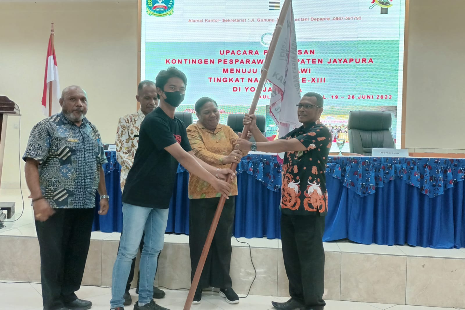 Upacara Pelepasan Kontingen Perparawi Kabupaten Jayapura Menuju Pesparawi Tingkat Nasional XIII di Jogyakarta berlangsung di Aula Lantai 2 Kantor Bupati Kabupaten Jayapura, yang ditandai dengan penyerahan bendera kepada Ketua Lembaga Pengembangan Pesparawi Daerah (LPPD) Kabupaten Jayapura, Jumat (17/6/2022).