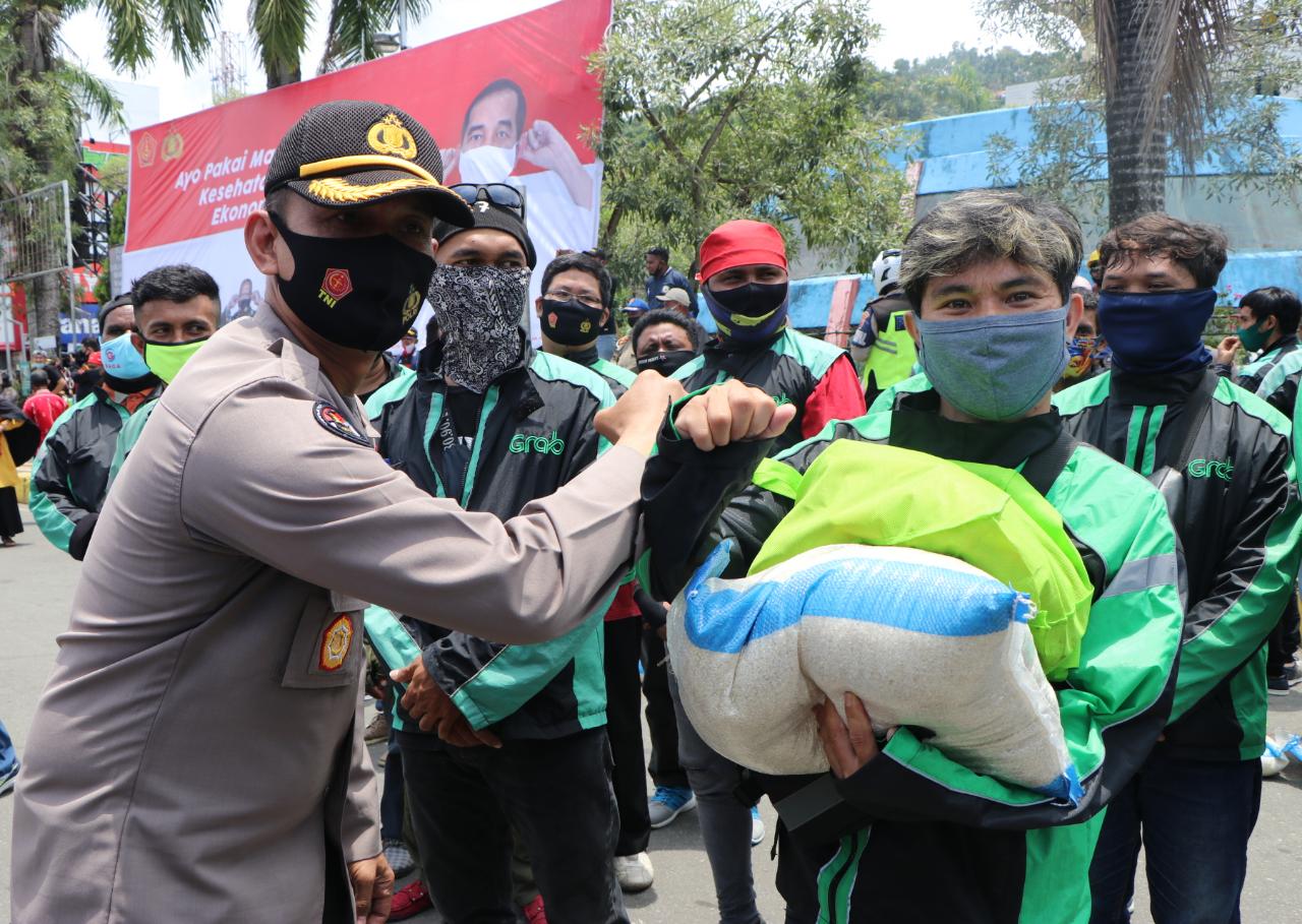 Untuk bantuan sembako, Kapolda menjelaskan, dibagikan bersama masker kepada yang kami undang dalam kegiatan tersebut antara lain,komunitas dan ojekker dan sembako yang dibagikan berjumlah 400 buah,” jelasnya.
