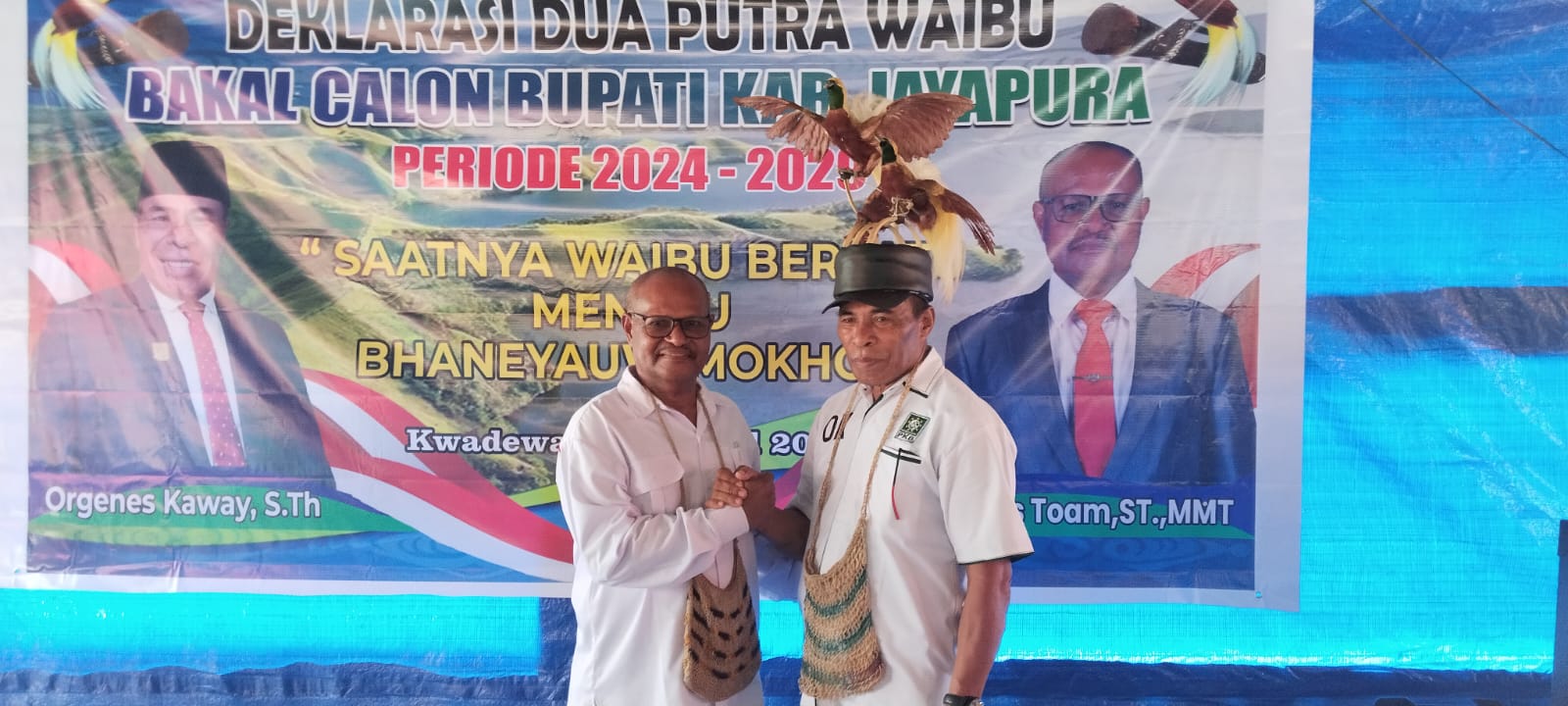 Kilaspapua, Sentani- 5 ondoafi dan 12 kepala suku Waibhu satu hati nyatakan sikap mendukung 2 putra terbaik Waibhu yakni, Orgenes Kaway, S.Th dan Alpius Toam, ST, MM.T untuk maju di Pilkada Kabupaten Jayapura sebagai bakal calon Bupati Jayapura periode 2024-2029  yang dituangkan dalam sebuah deklarasi ” Saatnya waibu Bersatu menuju Bhaneyauw Mokho “ di Serbea obhe kampung Kwadeware, Distrik Waibhu, Kabupaten Jayapura, Jumat (26/4/2024). Adapun lima ondoafi yang memberikan dukungan yakni, Kwadeware, Doyo lama, Yakonde, Sosiri dan Dondai.