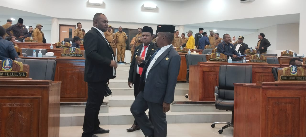 Bupati Jayapura saat berbincang-bincang dengan salah satu anggota DPRK Jayapura usai sidang.