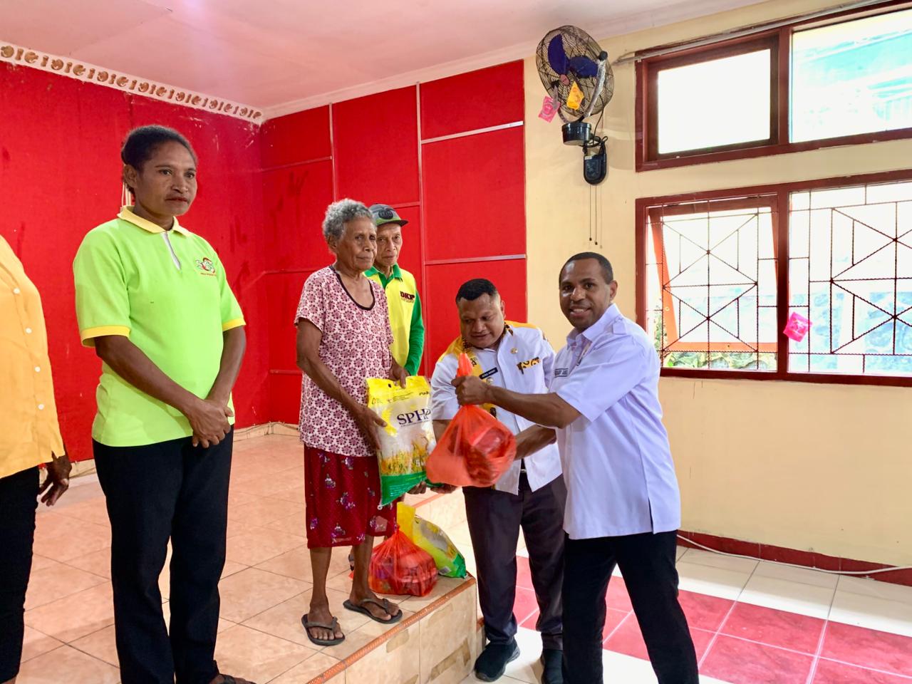 Ketua PD Gekira Papua, Richardo Eko Tabisu saat menyerahkan paket sembako kepada perwakilan petugas penyapu jalan di Kota Jayapura.