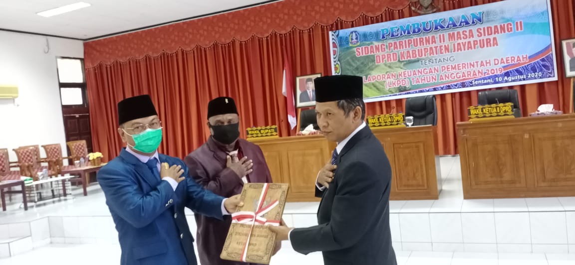 Wabup Jayapura saat menyerahkan dokumen LKPD Kabupaten Jayapura Tahun 2019 kepada Waket 1 DPRD disidang paripurna II masa sidang DPRD Kabupaten Jayapura.
