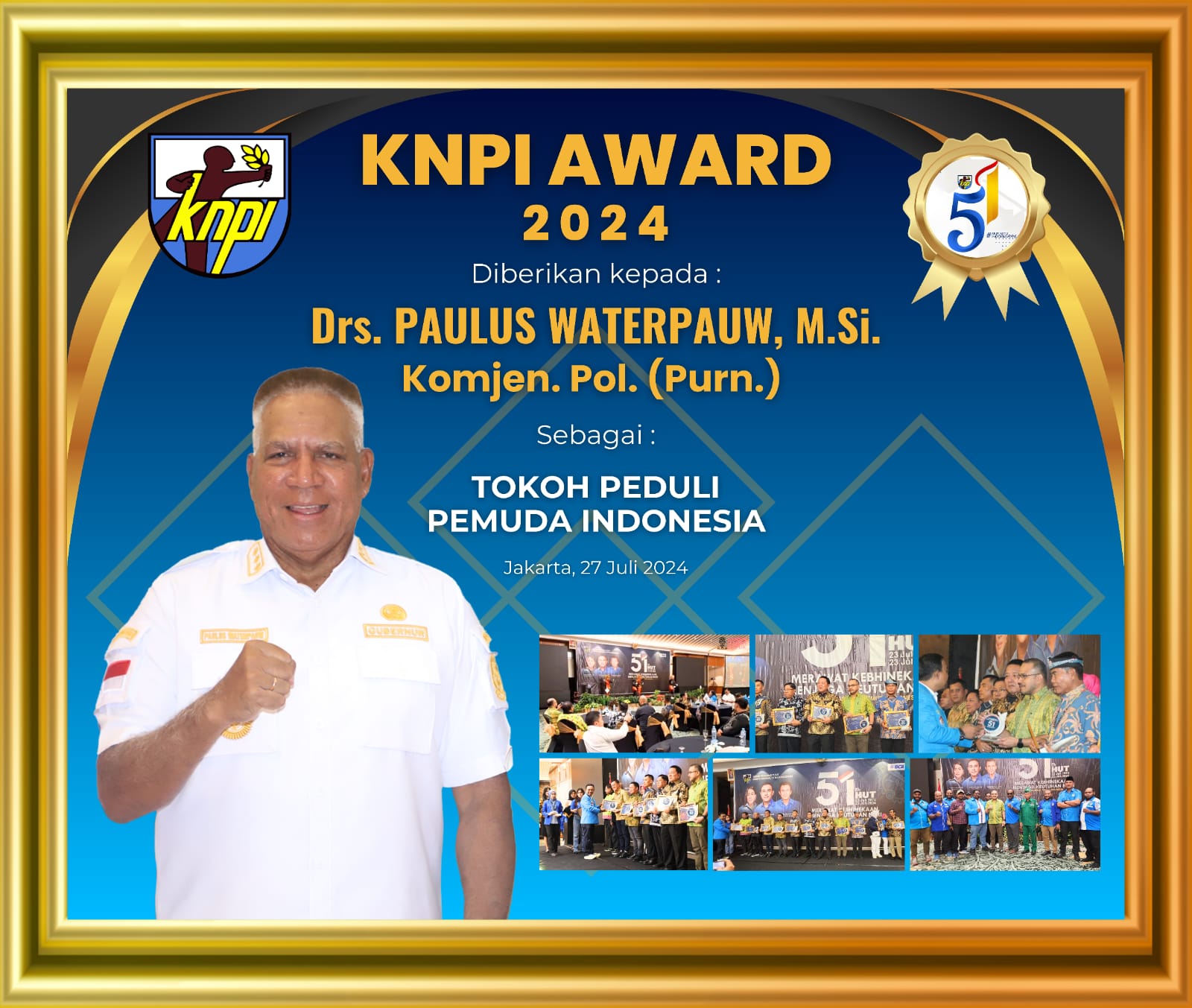 Kilaspapua, Jayapura – Komjen Pol. (Purn) Drs. Paulus Waterpauw, M.Si menerima KNPI award 2024 setelah dinobatkan sebagai tokoh peduli pemuda Indonesia. Hal itu terjadi pada saat peringatan Hari Ulang Tahun (HUT) ke-51, Dewan Pengurus Pusat Komite Nasional Pemuda Indonesia (DPP KNPI) yang digelar di Hotel Sahid Jaya Jakarta, Sabtu (27/7/2024).